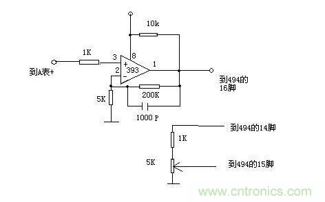 电流取样部分比电压部分稍多点,因为20A的电流表满量程199mV,1A时10mV,0.1A时只有1mV,呵呵,这个电压太小了,如果直接送到494去,那么电流控制精度就很差了,1mV电压估计494不会动作,所以我拆掉了LM393的1、2、3脚元件,用它来构成一个大约40倍的放大器,这样在10A 电流时输出4V,0.1A时有40mV,将此电压送到494的16脚,同15脚给定的约0-4V基准电压比较;