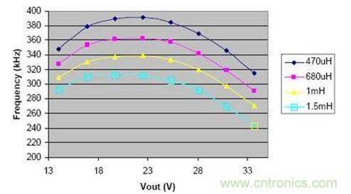下图给出了频率根据不同的输出电压和不同的电感值的变化曲线。