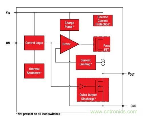 可以将负载开关想象成一个电子灯开关,用途是打开和关闭负载。基本负载开关只有四个引脚:VIN,VOUT,ON和GND。图1显示的是更加复杂负载开关中的功能。把负载开关接通,即通过将ON置为高电平会使电流从VIN流向VOUT。但断开开关时,没有从VIN流向VOUT的电流,并且所有下游器件也被关闭。负载开关的待机功耗有效地取代了VOUT上负载的待机功耗。