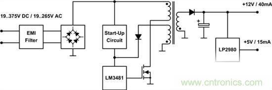 图1展示了这种转换器——包括输入滤波器、整流器、启动电路以及次级侧上的控制器线性稳压器。