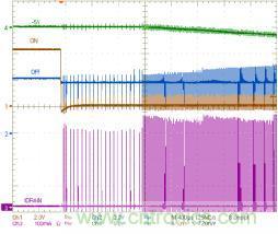 再按下开关时,ON引脚被强制连至SGND引脚,且连接时间大于DEB_ON,芯片退出零功耗模式。芯片通过软启动恢复开关操作,重新开始输出功率。在实际应用中,ON和OFF引脚可以由微控制器控制,如图3所示。实际上,这些引脚的上拉电阻有几微安的驱动能力,可在零功耗模式供给微控制器。