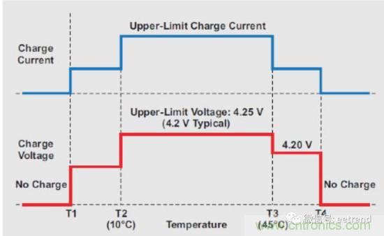 如图1所示,JEITA规范定义了最低温度(T1)、最高温度(T4)和位于二者之间的三个温度区(低、中、高),以确保充电安全。
