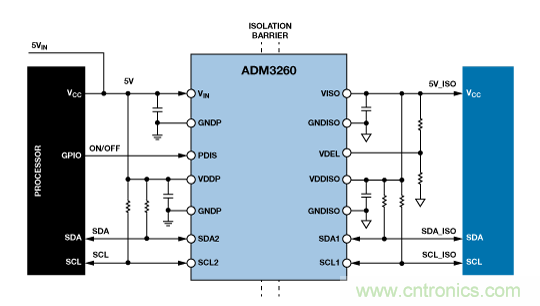 必须在原边智能器件(比如ADC或DAC)与副边处理器之间实现双向数据传输,并且电源必须从原边传输至副边。 如需隔离数据链路,就必须同时隔离数据线路和电源。 所有连接I2C链路的器件都必须与I2C总线隔离,如图6所示。
