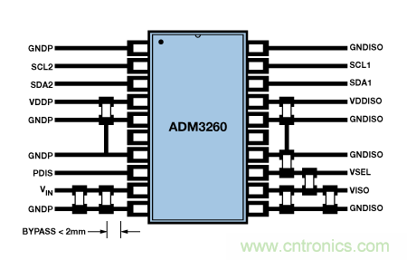进行正确的PCB布局对于确保在实际设计中实现2.5 kV的额定隔离性能至关重要。 主要考虑因素是逻辑端GND和总线端GND之间的爬电距离(导线表面之间沿壳体的最短距离)和电气间隙(最短空气距离)。 ADM3260的逻辑接口不需要外部电路。 输入和输出供电引脚需要电源旁路,如图11所示。欲了解有关PCB布局指南和电磁辐射(EMI)控制的更多信息,请参考AN-0971应用笔记"isoPower器件的辐射控制建议"。