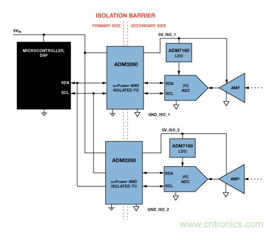 通常需通过I2C总线并跨越隔离栅传输精密转换器数据(ADC或DAC)。 图3显示两个隔离数据采集系统。 这些应用还需要隔离式电源来为副边的转换器和放大器供电。
