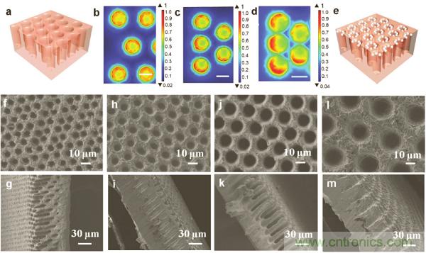 b-d)多孔铜集流体上表面的电流密度分布模拟结果,图中标尺为10 μm。