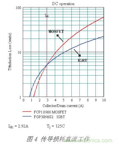 在比较额定值为600V的器件时,IGBT的传导损耗一般比相同芯片大小的600 V MOSFET少。这种比较应该是在集电极和漏极电流密度可明显感测,并在指明最差情况下的工作结温下进行的。例如,FGP20N6S2 SMPS2 IGBT 和 FCP11N60 SuperFET均具有1℃/W的RθJC值。图4显示了在125℃的结温下传导损耗与直流电流的关系,图中曲线表明在直流电流大于2.92A后,MOSFET的传导损耗更大。