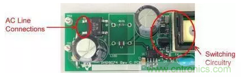 图1是这些非计划中电容的一个实例。图中的右侧是一个垂直安装的FET,所带的开关节点与钳位电路延伸至了图片的顶部。输入连接从左侧进入,到达距漏极连接1cm以内的位置。这就是故障点,在这里FET的开关电压波形可以绕过EMI滤波器耦合至输入。