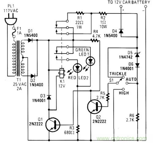不管是一个低电流(50毫安),还是高电流(1安培),该电路都有能力提供。你可以选择手动充电或者自动模式。当电流很低的时候,你可以在选择高电流充电之前先用低电流。如果电池的电压过低,齐纳二极管D5将有足够的电流来产生一个穿过R6的电压从而使得Q2开启。