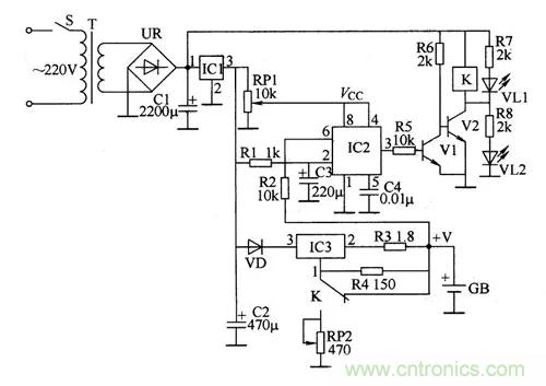 电源电路由电源开关S、电源变压器T、整流桥堆UR、滤波电容C1、C2和三端集成稳压集成电路IC1组成;充电电路由二极管VD、三端可调稳压集成电路IC3、电阻R2~R4、电位器RP2和继电器K的控制触头等组成;控制电路由时基集成电路IC2、电位器RP1、电阻R1、R5~R8、电容C3、C4、晶体管V1、V2、继电器K和发光二极管VL1、VL2组成。