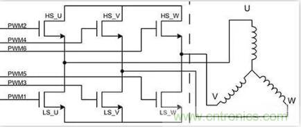 图 1:数控三相 BLDC 电机通常使用三对 MOSFET 进行控制,一对 MOSFET 为一个电机绕组提供 AC 电压。(图片来源:Texas Instruments)