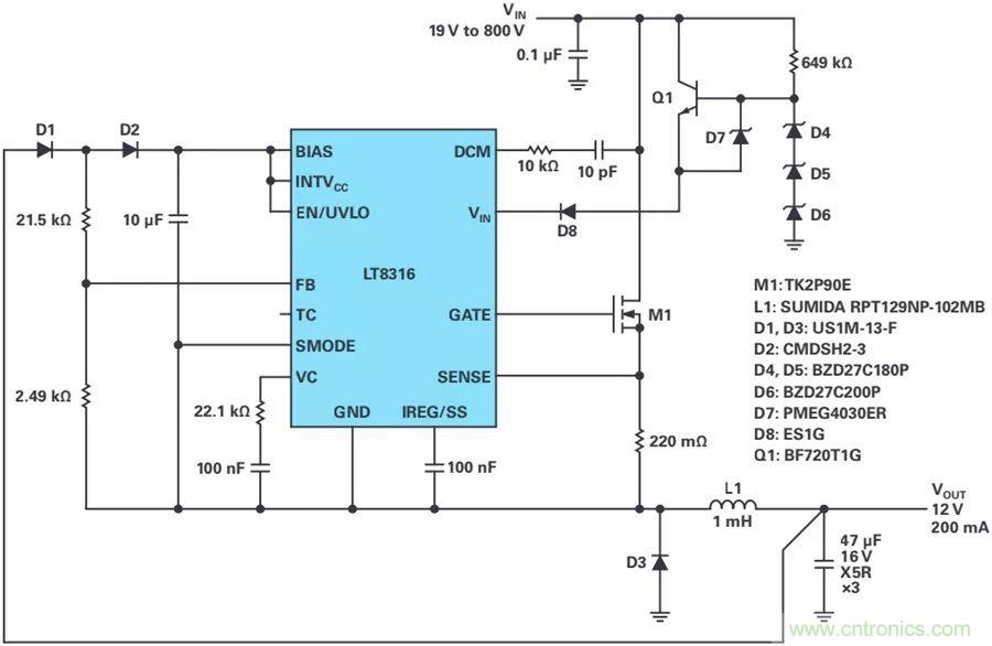 图8. 采用低启动电压的800 VIN非隔离降压转换器的原理图。