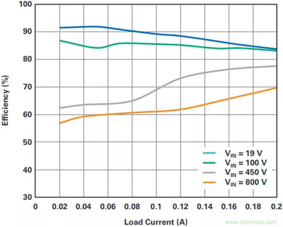 与反激式转换器一样,降压转换器的电源电压也可以扩展。图5显示了输入电压最高可达800 V的降压转换器的原理图。LT8316的电源电压和VIN引脚之间存在一个220 V齐纳二极管。鉴于齐纳二极管存在电压容差,最小的启动电压为260 V。启动之后,LT8316继续以更低的电源电压正常运行。图6显示了不同输入电压下的效率,降压转换器的峰值效率达到91%。图7显示了负载和电压调整率。