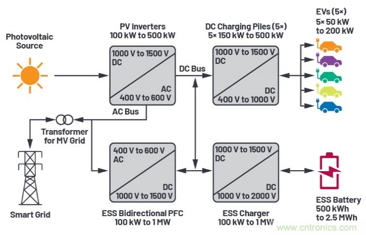未来电动汽车充电站的功率变换系统配置示意图