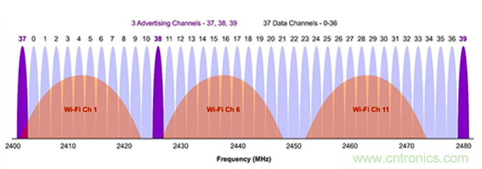 蓝牙LE无线电使用2.4GHz频段,拥有40个频道,间隔为2MHz。其中保留了三个RF通道(37、38和39)用于广告功能,这些功能允许发现附近的设备。通道0-36保留用于数据传输。广告频道占据频谱的不同部分,以抵消来自802.11或Wi-Fi无线电传输的干扰(参见图2)。