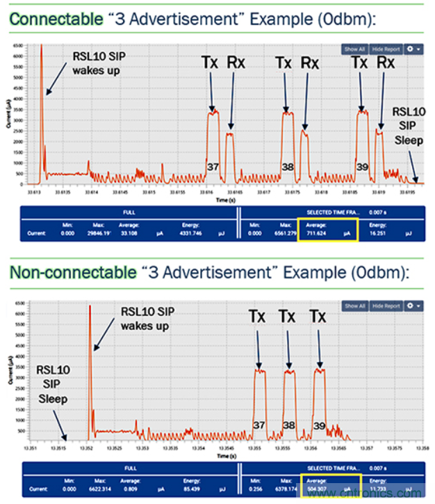 蓝牙LE广告数据包可以是“可连接的”或“不可连接的”。图3显示了通过功率分析仪测量的安森美RSL10片上系统(SIP)无线SoC的操作,并显示了可连接(左)和不可连接(右)广告事件,均在0dbm发射功率下。