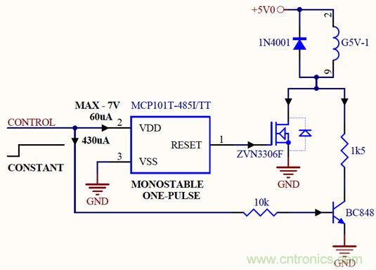 图2:用一个高电平有效的复位芯片来产生吸合电流脉冲,MCP101和ZVN3306F可以很好地与各种继电器一起使用;类似的器件也可以很好地工作(如MAX810)