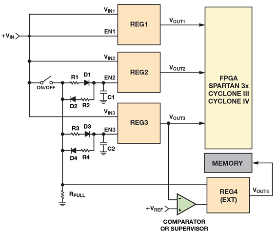 下图所示为一种要求多个供电轨的FPGA应用,这些供电轨为内核电源、I/O 电源、辅助电源和系统存储器电源。通常来说,FPGA应用会具有一个内置上电复位电路,可确保在所有电源均达到其阈值后才允许对器件进行配置。这样有助于降低电源时序控制要求,但为了实现较小浪涌电流电平并遵循连接至FPGA的电路时序控制要求,供电轨应当按内核电源-辅助电源-I/O电源的序列上电。