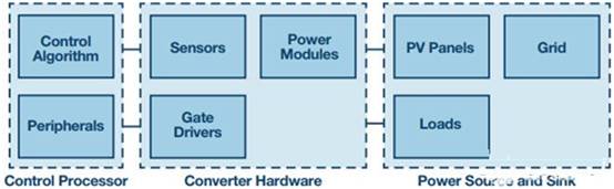 考虑并网住宅太阳能逆变器的简化图,如图1所示。太阳能电池板上的太阳辐射产生与辐射强度成比例的直流电。转换器将这种直流电转换为交流电,可用于家用电器,也可以馈送到电网。来自信号链中各个点的电流和电压由适当的传感器检测,并将馈送到逆变器中的控制处理器。在控制处理器上运行的算法分析这些信号并控制功率模块,使产生的电流和电压达到电网所需的频率、幅度和相位。在这种情况下,太阳能电池板充当电源,电网和家用电器充当水槽。在不同的电源转换系统中,源和灌电流会有所不同,但大多数将落入图2所示的结构中。