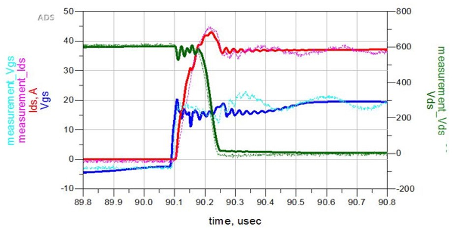 半导体工程师可以为其转换器器件仿真采用实证分析/数学模型,该模型中包括高频表征(开关晶体管模型中“零偏”和导通状态的 S 参数测量),以及电子设计自动化软件。凭借该技术,他们能够显著改进仿真数据与测得数据的匹配度(参见图 4)。
