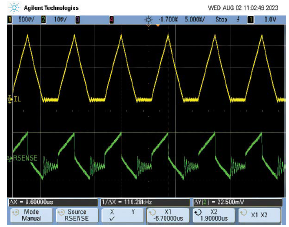 图11.超小电感电流波形。电流和RSENSE中出现振铃表明电源处于DCM模式。