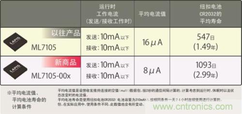 LAPIS Semiconductor去年推出的“ML7105”,实现了业界顶级的低耗电量(收发数据包时的运行状态)。此次开发出的新品“ML7105-00x”,不仅保持了运行状态下的低耗电量性能,而且平均电流还减少了一半。所谓平均电流,是指按一定间隔反复收发数据包时的运行状态(耗电量大)与休眠状态(耗电量小)的平均电流值。通过大幅减少改变状态所需的时间,使平均电流减半,从而使电池寿命可达2倍。因此,按LAPIS Semiconductor的工况条件,支持Bluetooth® Low Energy的、使用纽扣电池(CR2032)的设备其电池寿命即使在24小时连续工作的条件下,也可充分使用2年。