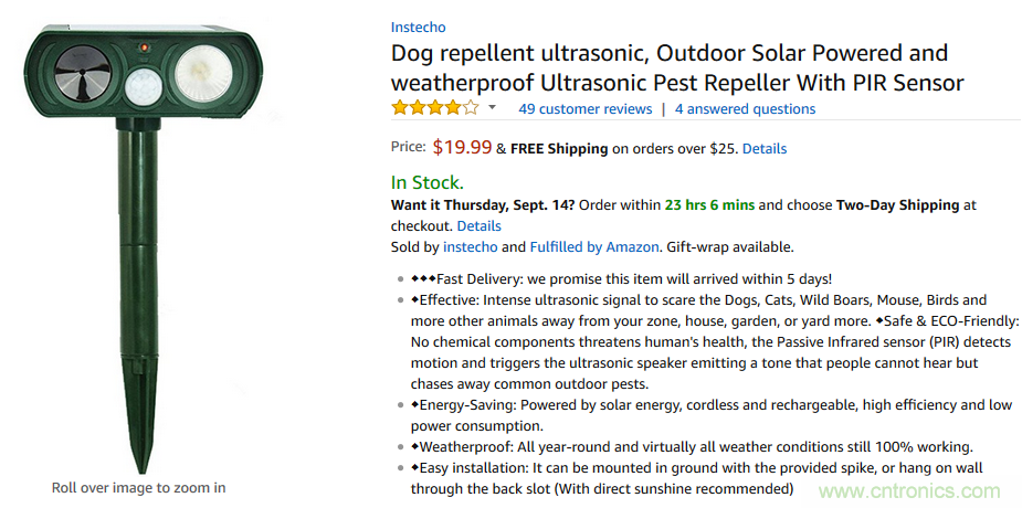 亚马逊上有一款超声波驱狗器,香港一家名叫instecho的公司产的,这款配有太阳能电池板和PIR传感器的太阳能超声波驱蚊器仅卖20美金,能通过发出超声波信号,将动物赶出自己的院子,同时又不会骚扰邻居。