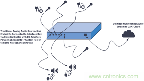 如今,现代化会议室的音频装置面临的主要障碍之一是需要将各种输入/输出传感器连接到主音频控制台。通常是在每个节点使用单独的点对点屏蔽电缆来实现,但这种做法非常繁杂,且仍然需要在每个节点提供单独的外部电源。除了做法繁杂之外,这些电缆还携带模拟音频信号,易受明显的频率下降影响,特别是在长距离安装,或者在使用经济型电缆选项时。