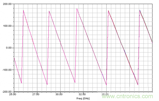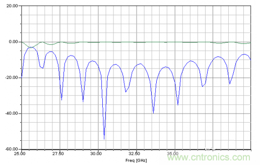 图 6 中可看出,在 31GHz-38GHz 的频率范围内,合成网络背靠背仿真的输入和输出端口回波损耗小于 -12dB,插入损耗小于 0.6dB。