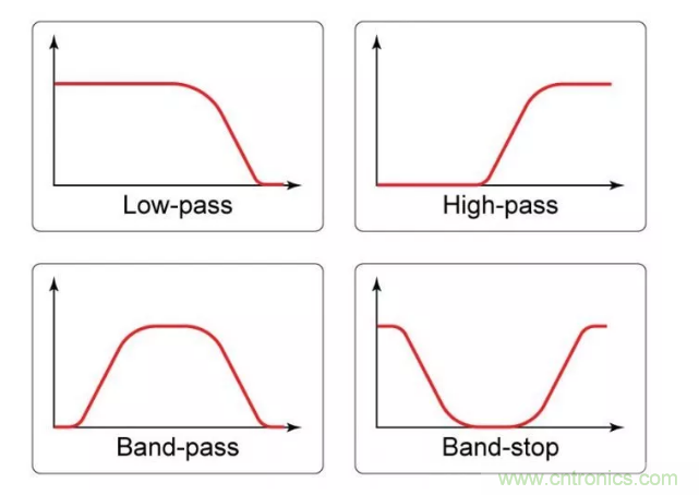 滤波器可以放在与滤波器频率响应的一般特征相对应的广泛类别中。如果滤波器通过低频并阻止高频,则称为低通滤波器;如果它阻挡低频并通过高频,它就是一个高通滤波器。还有带通滤波器,其仅通过相对窄的频率范围,以及带阻滤波器,其仅阻挡相对窄的频率范围(图2)。