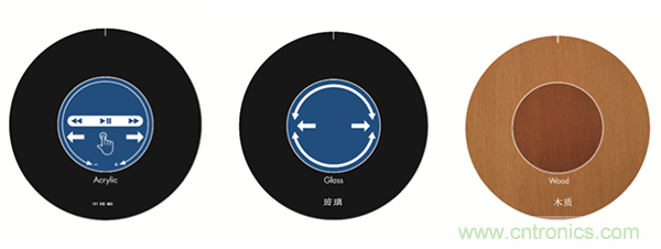 覆盖层不仅决定着终端产品的外观,还决定了其感应灵敏度。图4显示了采用电容传感技术的系统中所使用的不同类型的覆盖层,如木质、丙烯酸和玻璃等。实验结果显示,所有这些覆盖层均需要调试才能可靠工作。因为固定问题而导致的覆盖层识别等问题在消费应用中最常见。