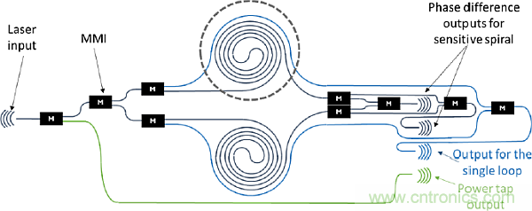 改进后的MOM压力传感器设计,MZI是平衡的;第一个是大范围测量用单回路,第二个将敏感螺旋臂中的信号分成两路去相位输出,这样就能始终对每一压力进行灵敏测量(图3)。