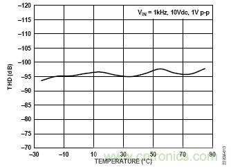 图7显示了系统线性度与输入偏置电压的关系,使用的输入信号频率为1 kHz,幅度为1 V p-p。图7表明,输入偏置电压对线性度没有明显影响,总谐波失真(THD)保持稳定。