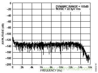 AD7768-1上的模拟输入和基准电压输入缓冲器设置为预充电模式。ADA4945-1 FDA设置为低功耗模式。在全功率模式下,FDA可以提供更宽的带宽和更好的线性度性能。但是,由于此设计的目标带宽小于50 kHz,因此低功耗模式就够了。通过使能AD7768-1内部预充电缓冲器,可以实现更好的线性度和噪声性能,而不会显著增加系统功耗。有关匹配驱动器放大器以及使用AD7768系列的输入缓冲选项的更多信息,参见应用笔记AN-1384。
