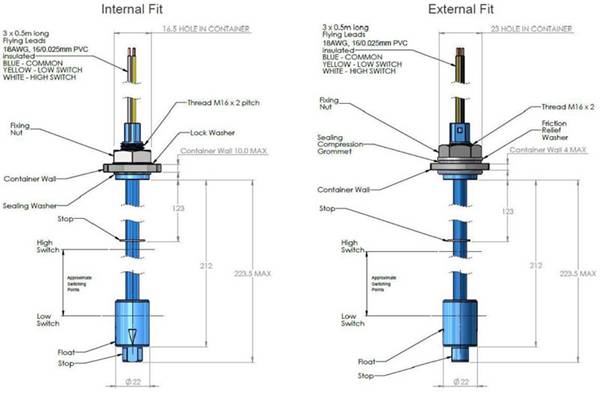· LDS309-11N,外壳和浮子为玻璃纤维填充的尼龙 6.6,用于压力最高达 4.7 巴的油、燃料和非离子液体。它能够感应到液位的微小变化,在工作和释放之间有 8.65 mm 的窄行程差。该设备使用 SPST 开关,额定负载高达 70 W,电压为 200 伏直流或 250 伏交流。